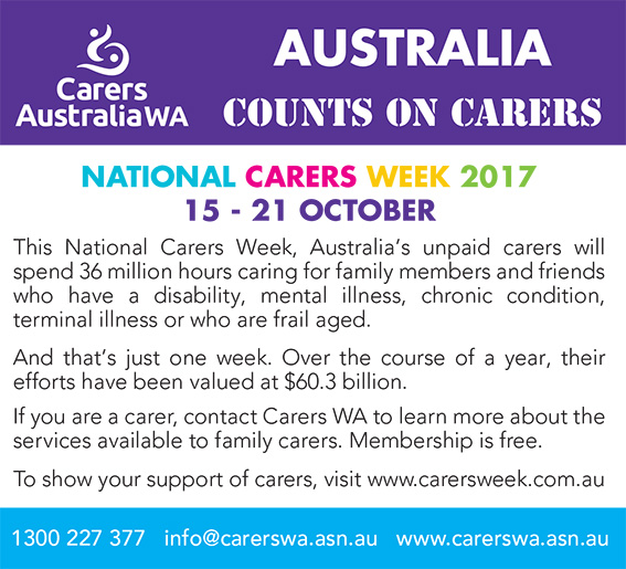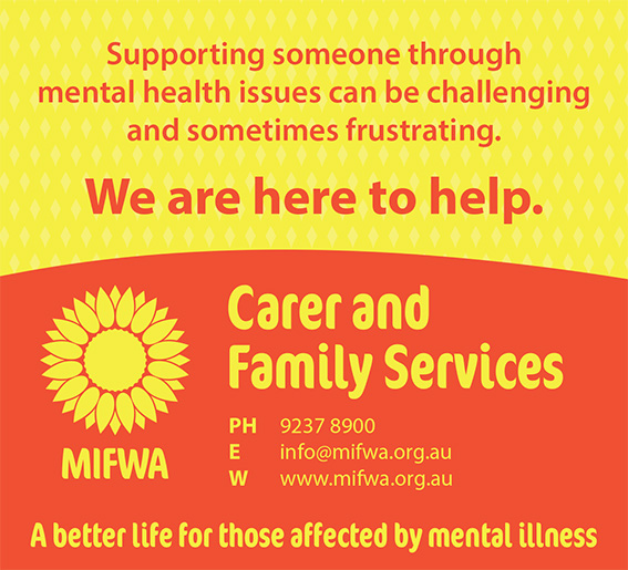 This year, Carers Week will be held from Sunday 15 October to Saturday 21 October 2017 with the primary objective of reaching out and supporting these carers. The Mental Illness Fellowship of WA (MIFWA) provides a range of services and programs for carers such as Building a Future – for carers of people with a mental health issue; retreats, social connections and support groups, plus Carer Peer Support Workers in Fiona Stanley, Osborne Park and Joondalup hospitals. For more information about Carers Week events or MIFWA’s Carer Services, contact Samantha.Scott@mifwa.org.au or call 9237 8900.