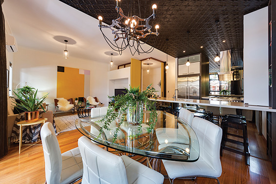 The open-plan kitchen and dining area is united by a beautiful, chocolatey-brown pressed-tin ceiling, while next door the lounge’s white walls ensure it doesn’t get too dark and gives the impression of extra space.