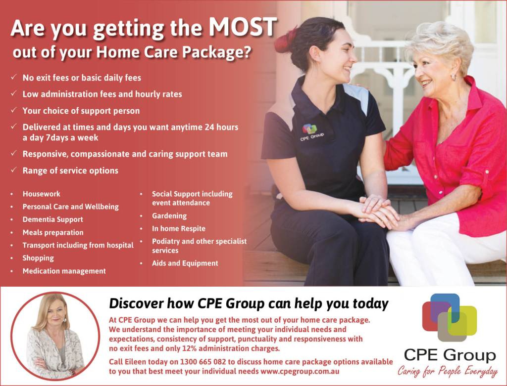 At CPE Group there are no basic daily fees or exit fees and only a 12% administration fee of each package value. CPE Group’s Support Manager, Eileen Wilson, can discuss home care package options available on 1300 665 082.