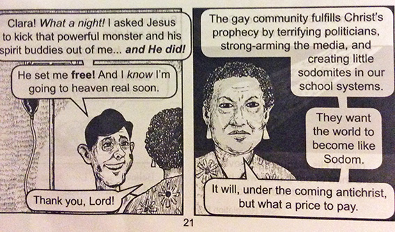 The comic also claims “the gay community fulfills Christ’s prophecy [of the end of the world] by terrifying politicians, strong-arming the media, and creating little sodomites in our school systems. They want the world to become like Sodom.”