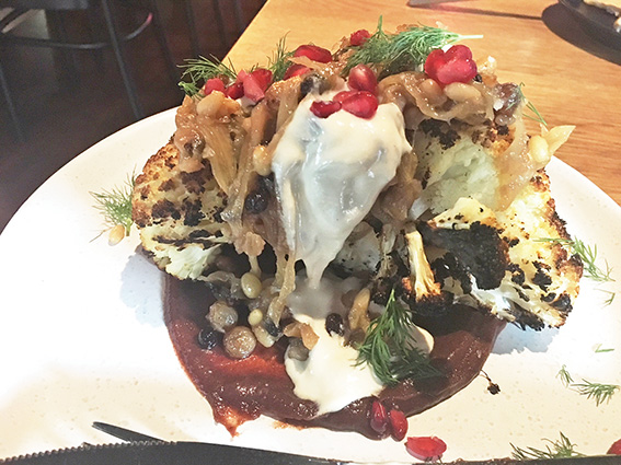 Our eyes were out on stalks when half a cauli appeared, crusted in date jam, caramelised onion, sultanas, pine nuts and tahini, and liberally sprinkled with fresh pomegranate seeds.