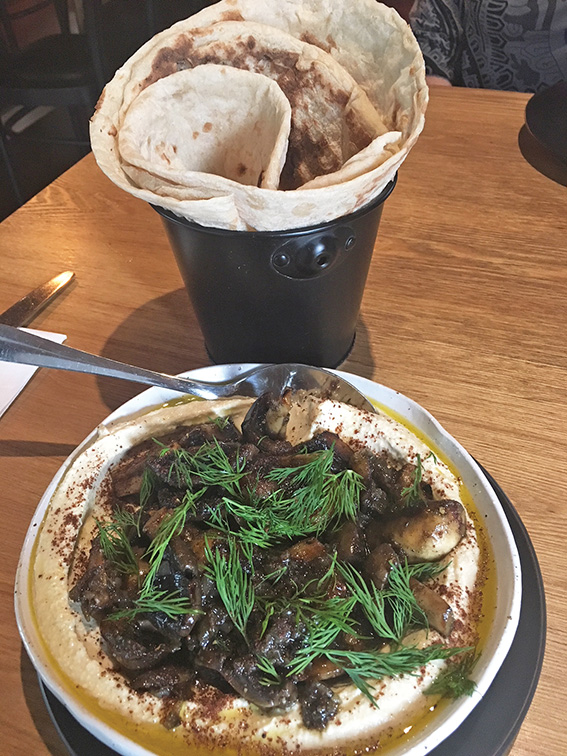 In the middle of a thick collar of the smoothest, and most flavoursome hummus I’ve had, was a glistening mound of pan- fried mushrooms ($18).