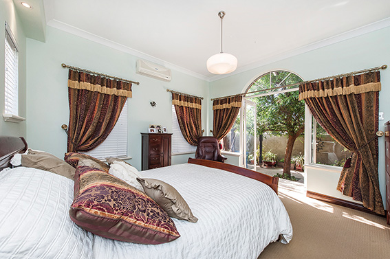The large main bedroom in the extension has a walk-in-robe, stylish ensuite with jarrah vanity, and french doors opening onto the garden.