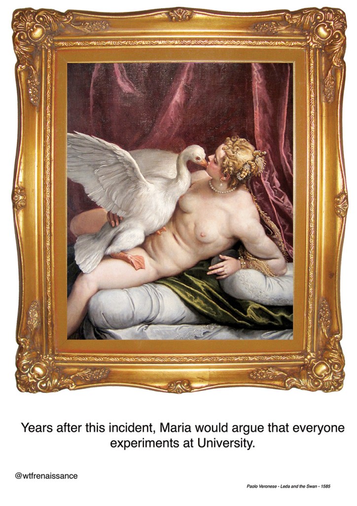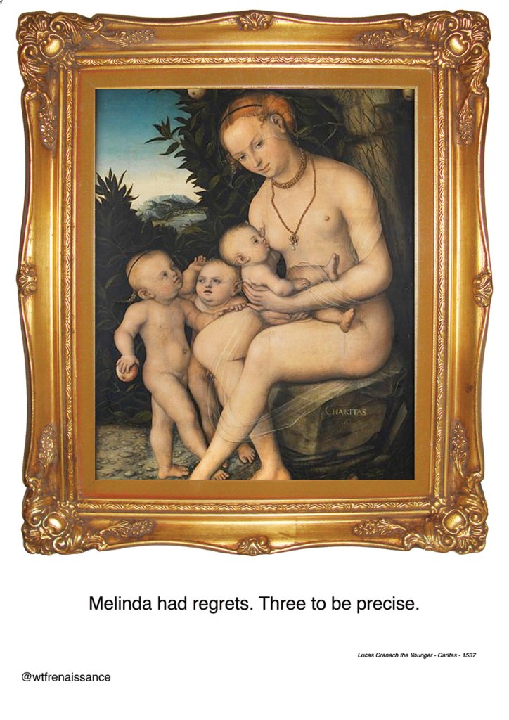 Thompson says the best way to describe it is to “imagine going to the Louvre with your most sarcastic friend or relative. The one who has to make up a little back story for the paintings. WTF Renaissance is real Renaissance paintings with fictional captions, mostly set in the modern era. It’s like watching a classic film with captions from The Simpsons, or Samantha Bee.”