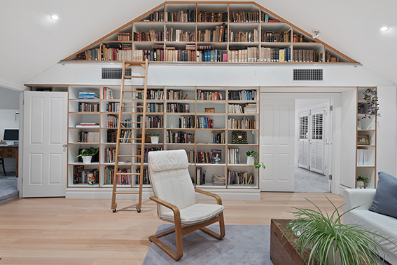 The main bedroom is on the second level, where a massive bookshelf takes up the entire wall of a generous sitting room, which includes a ladder to access books at the summit.
