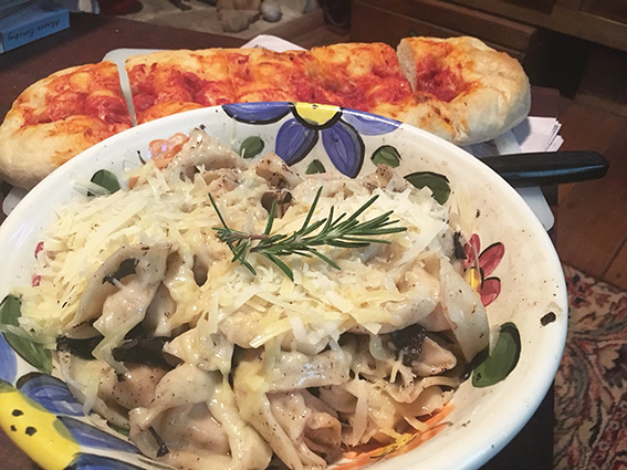 Tonight we’re having porcine mushroom pasta in a spicy red Napolitana sauce, and he’s even offered to cook it—well zap it in the microwave at least.