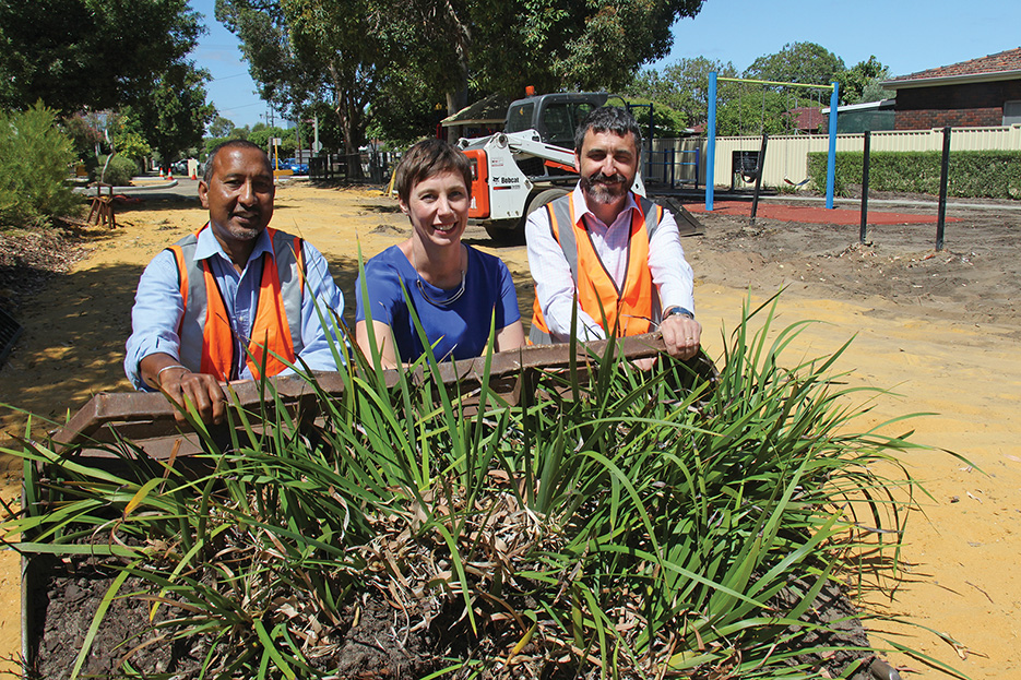 Vincent mayor Emma Cole dropped in with the council’s new engineering director Andrew Murphy (right) and parks co-ordinator Ian Ellies (left) this week to check the ongoing work to double the size of the neighbourhood park at the end of Hyde Street.