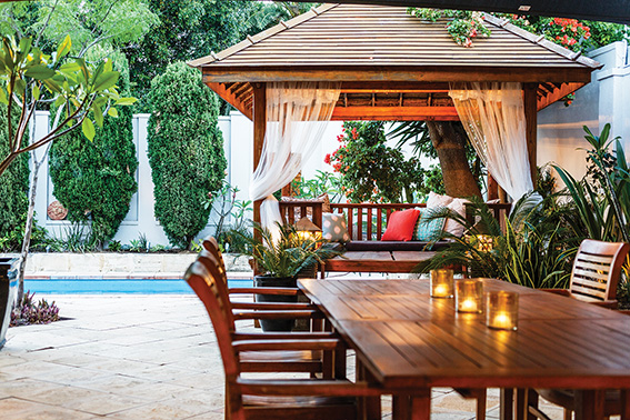 The soothing tinkle of a water feature adds to the ambience, as does the Bali-style cabana next to the sparkling pool.