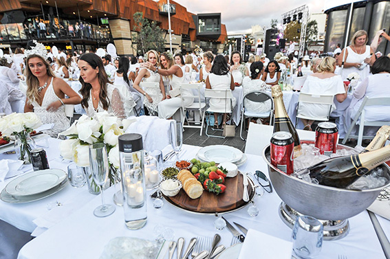 Diner en Blanc guests wait at meeting points across the metropolitan area, “conducting themselves with the greatest decorum, elegance, and etiquette”, before travelling by bus and train to a secret location to eat. The event is held in 70 cities worldwide and 2500 people dressed in white attended the Perth nosh-up at Yagan Square.