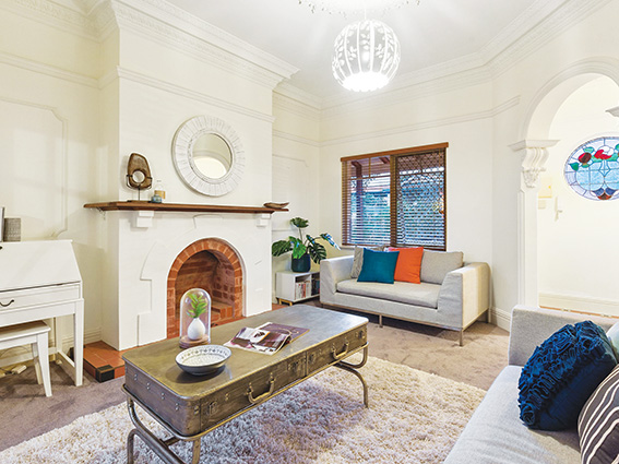 Inside there are plenty of reproduction touches, like the stained-glass front door, brick fireplace, ceiling roses and honey-gold timber floors.
