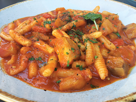 The pasta was perfectly al dente with a wonderful chewy springiness, and the braised eggplant and baby tomatoes enriched the sauce, which clung like a parting lover to the doughy morsels.