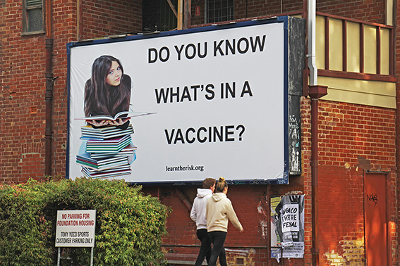 Emblazoned on the billboard are the words; “Do you know what’s in a vaccine?” and the website “learntherisk.org” which cites long-discredited fraudulent research by UK former-doctor Andrew Wakefield.