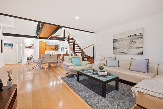 Soft, butter-yellow timber floors glow underfoot in the spacious open-plan, while high over head a timber and steel gantry walkway separates the upper-level bedrooms.