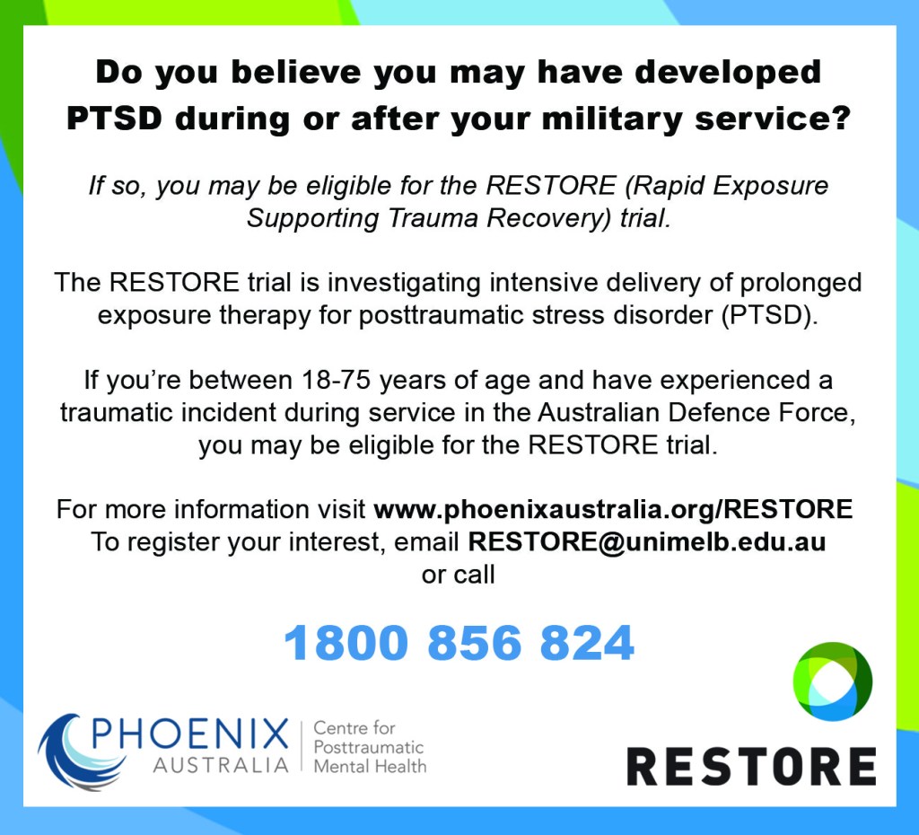 The Rapid Exposure Supporting Trauma Recovery (RESTORE) trial is a collaboration between Phoenix Australia – Centre for Posttraumatic Mental Health at the University of Melbourne, Department of Veterans’ Affairs, Department of Defence, and the Veterans and Veterans Families Counselling Service (VVCS).