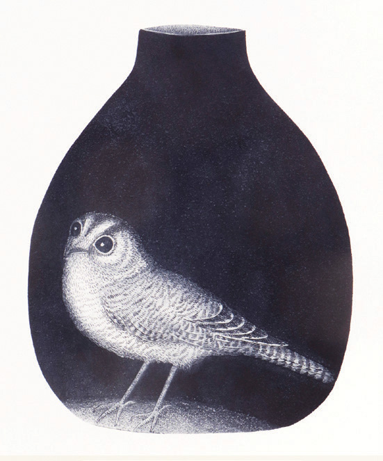 The delicately drawn bell jars, and their fragile inhabitants, seem to question whether the animals are being protected from mankind, or are victims of urbanisation.