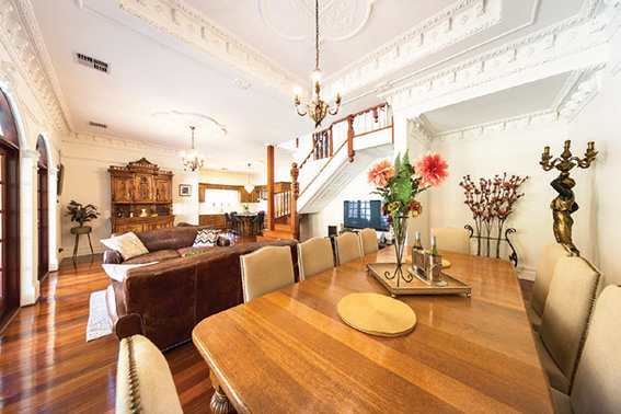 There’s nothing old world about the massive open plan, with its soaring ornate ceilings, fan lights and french doors leading to the alfresco.