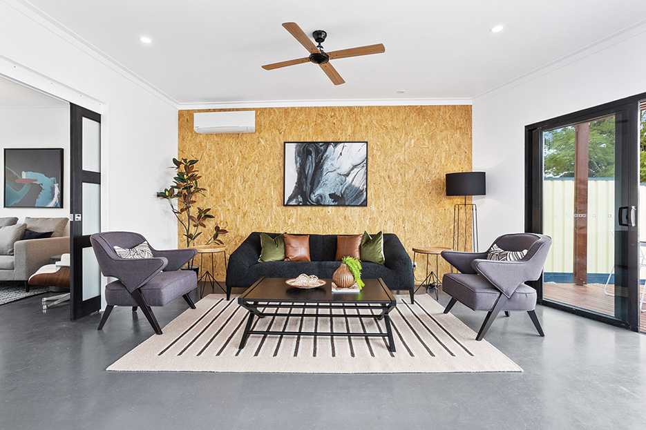 There’s a rain water tank plumbed into the toilet and washing machine, insulated exterior walls, and the power from solar panels feeds into a 10kW battery, making the home almost off-grid.
