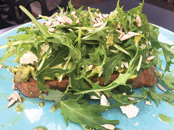 Topped with fresh rocket, the avocado flesh was liberally laced with edamame (immature soybean pods), making it a green, vitamin-enriched brunch on a thick slice of sourdough bread.