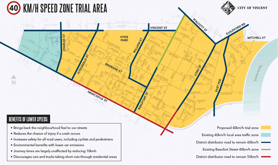 At Tuesday’s council meeting (October 16), Vincent councillors will vote on whether to proceed with a two-year, 40kmh trial south of Vincent Street, north of Charles Street and east to the Swan River.