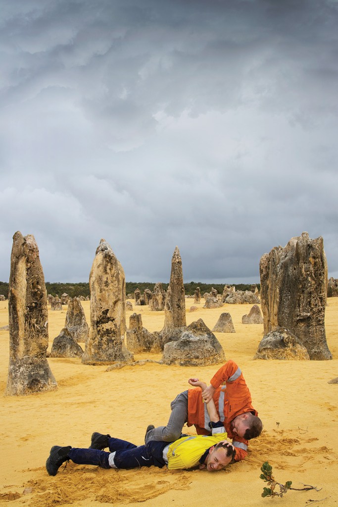 He snagged $3000 in prize money for Jacob and the Angel – “a self-portrait, depicting myself wrestling with my muse, close friend and fellow artist David Charles Collins at The Pinnacles desert, one of regional WA’s most haunting landscapes. We wear high-visibility workwear, the ubiquitous dress of mining industry workers.