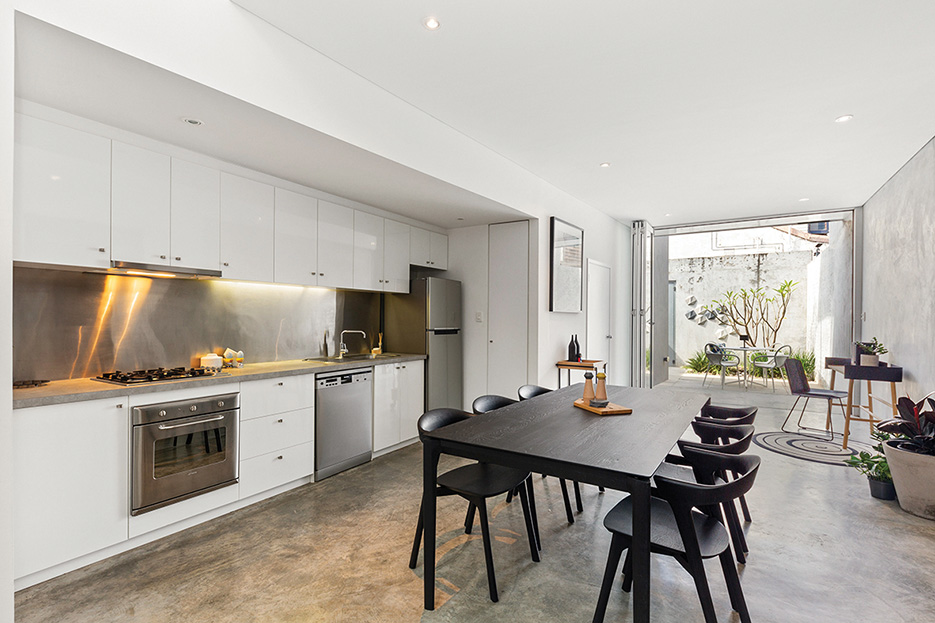 Polished concrete floors and white concrete walls create a warehouse ambience that extends to the courtyard alfresco.