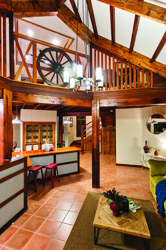 The formal lounge is redolent of a picture-perfect Crimbo with a natural stone fireplace to hang stockings, flanked by a tall Christmas tree. The spacious, rustic kitchen has a sweep of timber benchtops and a double pantry, and recycled pine and corrugated tin has been up-cycled on the many cupboards.