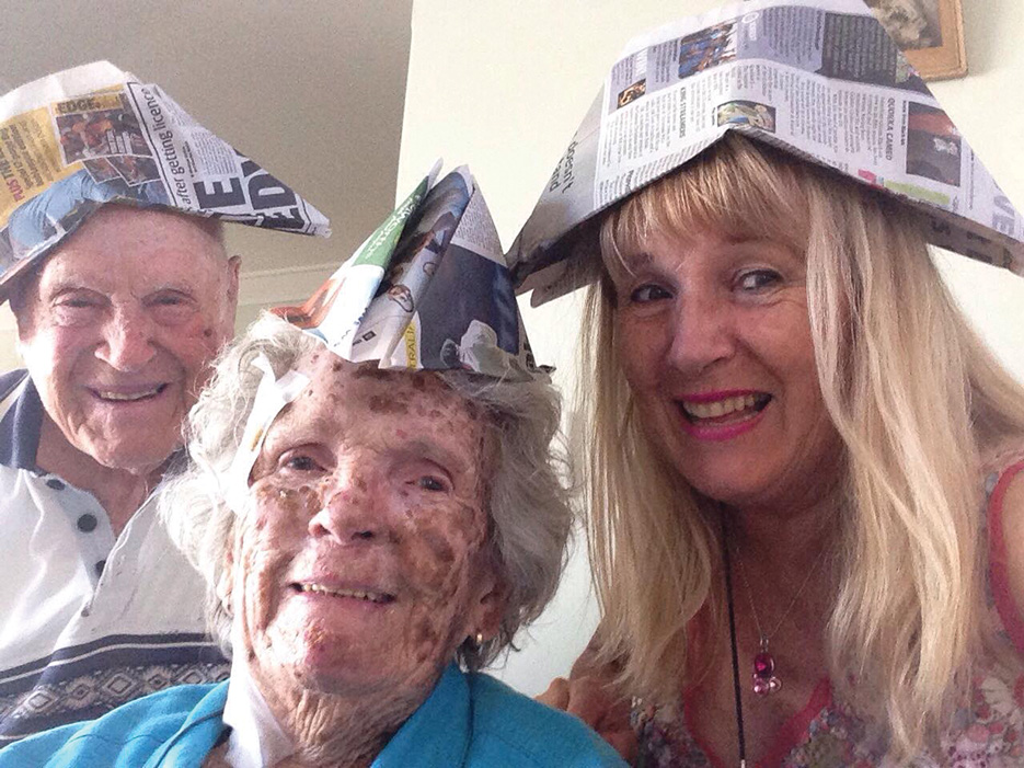 CATE JENNINGS enjoys making some newspaper hats with her 95-year-old dad Des, a World War II veteran, and her 94-year-old mum Kath, who also served in WW II with the Women’s Royal Australian Naval Service.