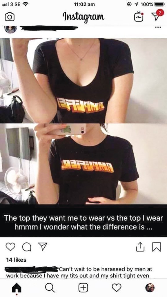 LESS than a year after the birth of the #metoo movement, Amplifier Capitol has demanded its female staff wear a low-cut, breast-revealing top.