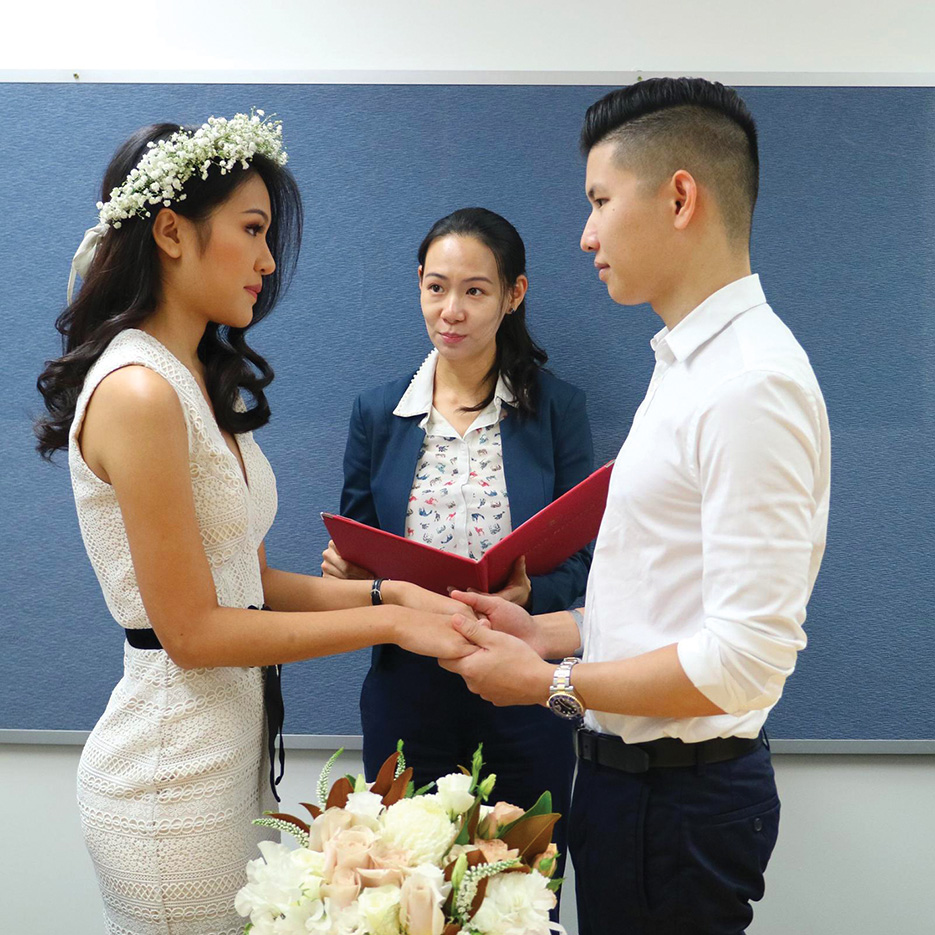 While the blue pin-up board in the immigration centre isn’t quite the background the couple were planning for a wedding photo, Ms Chen says the ceremony meant they could now apply for an offshore partner visa.