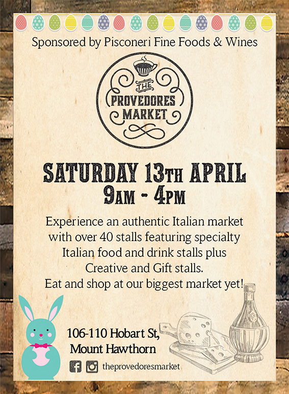 Come along to The Provedores Market Easter Edition, proudly sponsored by Pisconeri Fine Foods & Wines.