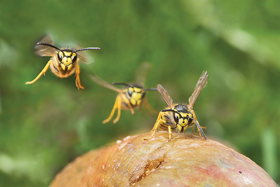 European wasps look similar to the yellow paper wasp, but are slightly longer, have black antennae and fly with raised legs (all other wasps dangle theirs).