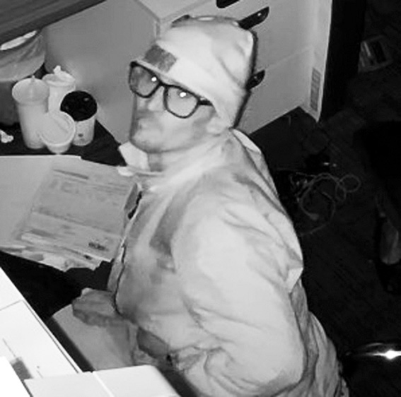 The man is described as light skinned, thin/medium build, with facial hair and black-rimmed glasses.