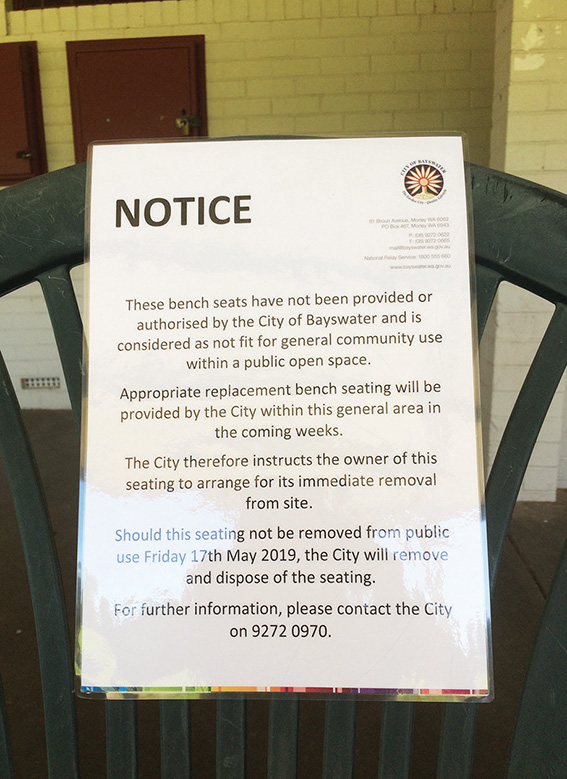 A KIND local who put out chairs for people at De Lacey Park has been given a stern “authoritarian” warning from Bayswater council to get rid of them.