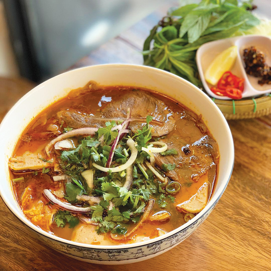 Supercharging the Bun Bo Hue is a side dish of mint, bean sprouts and extra chilli oil.