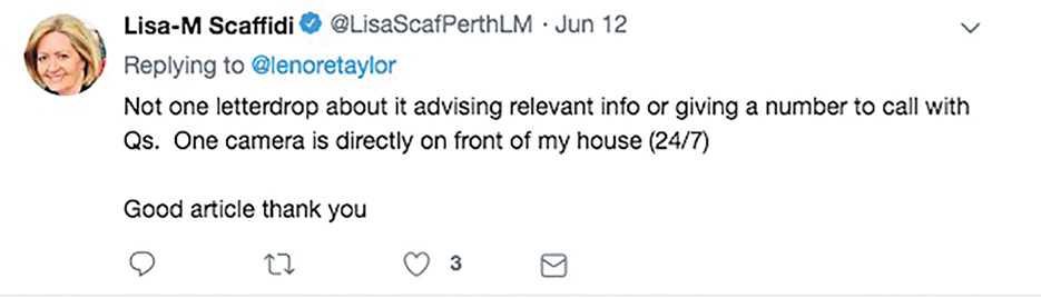 She said there was “not one letterdrop about it advising relevant info or giving a number to call with [questions]. One camera is directly [in] front of my house (24/7)”.