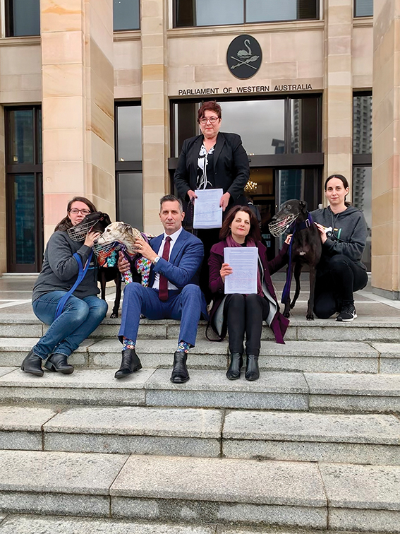 Greyhound advocates Alanna Christiansen and Andrea Pollard from Free the Hounds presented a 4000-signature anti-muzzle petition to state racing and gaming minister Paul Papalia at parliament on Wednesday (June 26).