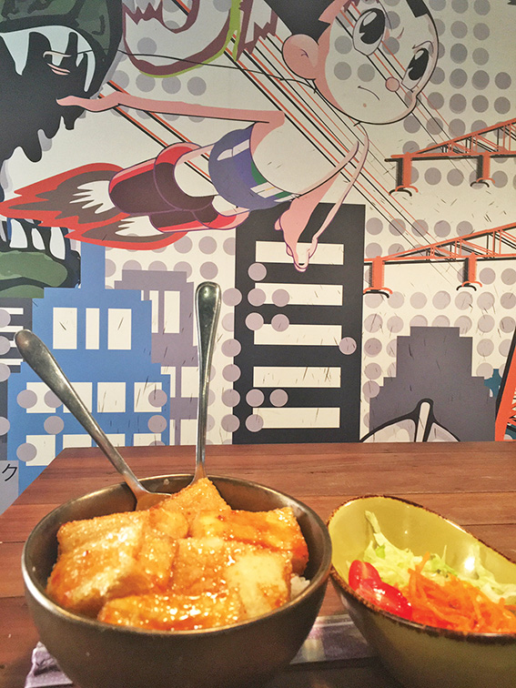 Unlike Astro Boy, depicted in the same mural, I didn’t have jet-power boots to escape, but I didn’t care because lunch was about to arrive at my table.