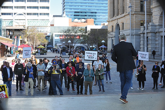 MEAA spokeswoman Tiffany Venning said the union had advertised the rally on Facebook, had sent a bulk email to its members, and put posters in main newsrooms and in locations around town.