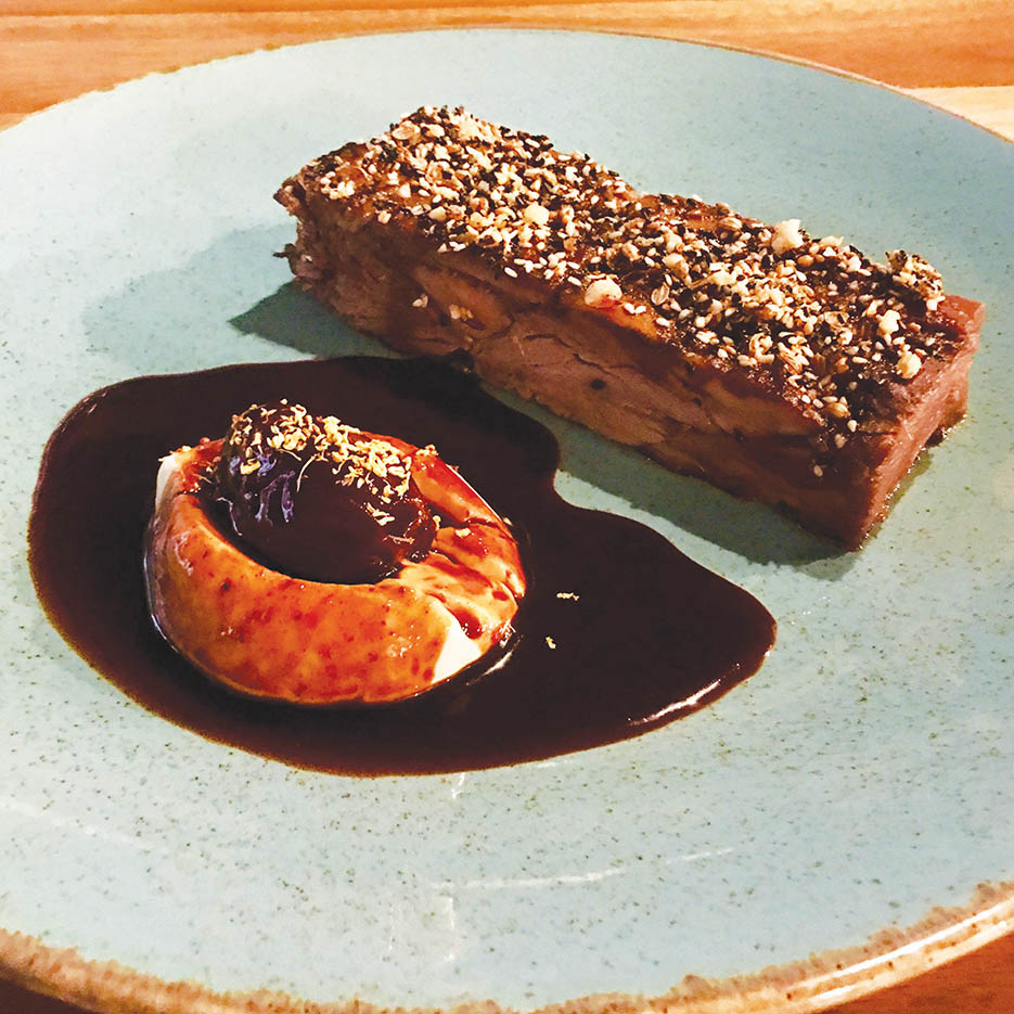 The dish is simply served with a rich red wine jus and a quenelle of silky, six-hour-hung labneh, topped with a smoked date.