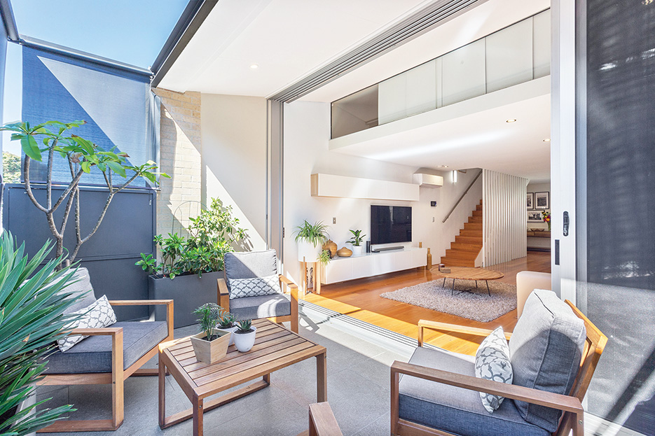 The open-plan living/dining/kitchen is in the middle section, where floor-to-ceiling stacker glass doors open onto a very generous north-facing terrace.
