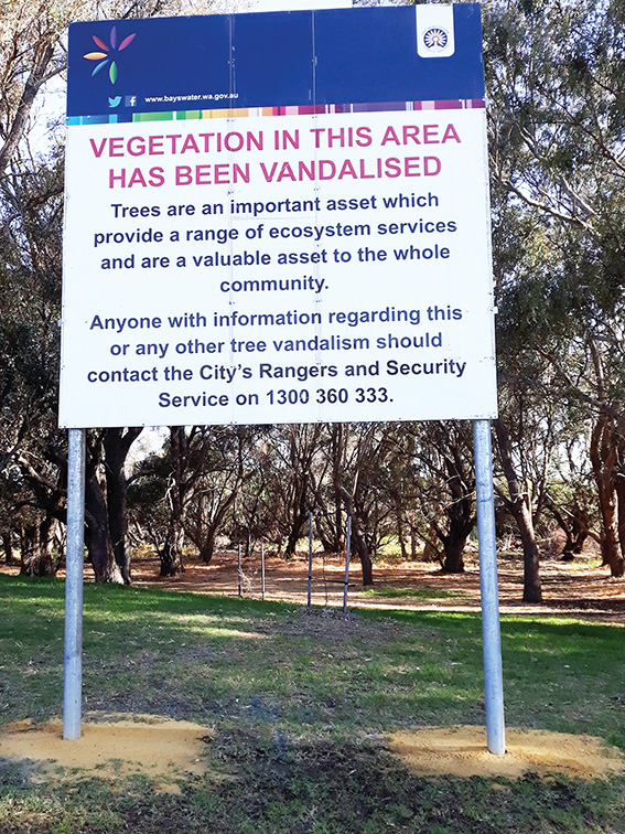 Under the council’s Urban Tree Policy a poisoned tree earns the neighbourhood a big shaming sign until a replacement is grown.