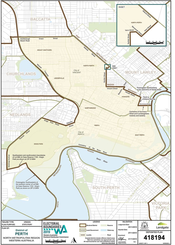 “This leaves a significant residential component of the suburb around Mount Street within the district of Perth,” making up 400 electors who usually vote at the Constitutional Centre in Havelock Street.