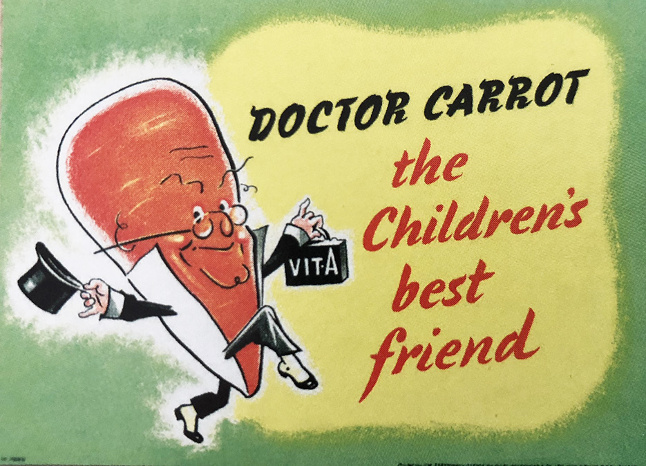 Following the success of wartime cartoon ‘Potato Pete’ in encouraging potato cultivation, Doctor Carrot (“the Children’s best friend”) was soon everywhere, from recipe pamphlets to billboards, before Disney was enlisted to add Carroty George and Clara Carrot to the Carrot Family. The indoctrination campaign was so successful that by 1942 the Ministry of Food used its 100,000 ton surplus of carrots as animal feed, likely compounded by an overload of official recipe suggestions that included carrot pudding, carrot marmalade, curried carrots, carrot cookies and even a dubious drink called Carrolade. (Carrot cigarettes never took off for some reason)