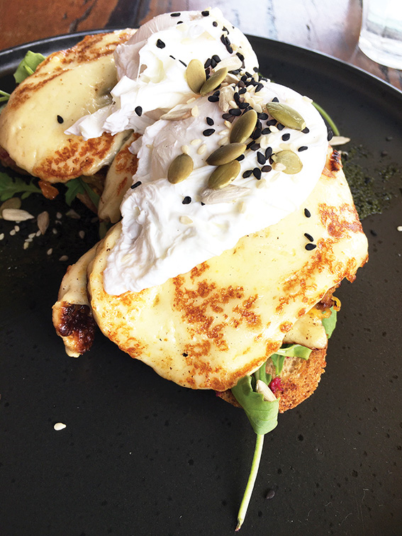 My mate went for the halloumi stack ($18) – two large slices of perfectly grilled Cyprian cheese topped with runny eggs.