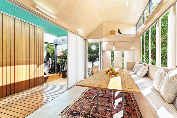 A bank of polycarbonate doors open onto a timber deck, creating an extra “room”, with stairs leading down to the garden.