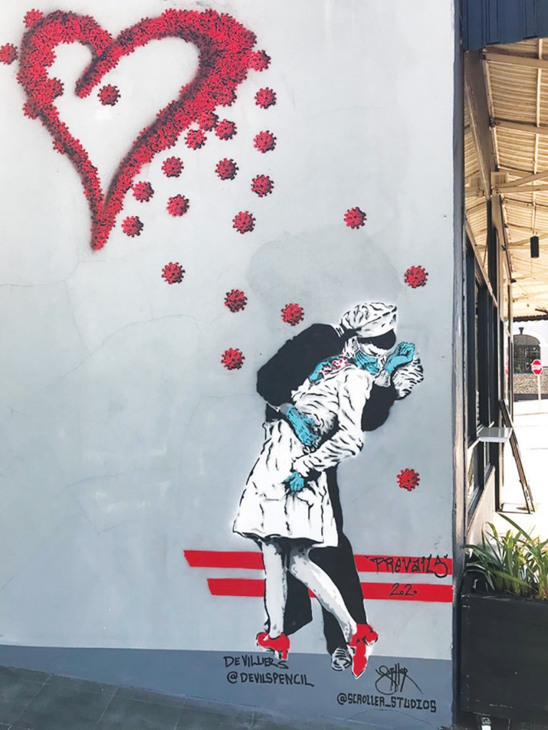 Price’s work “prevails” adds some contemporary PPE to the mysterious kissers, who have never been conclusively identified, and they’re surrounded by spiky coronavirus-spheres that’ve been herded into a love heart. Vincent mayor Emma Cole says: “The Covid-19 pandemic is a once in a lifetime event and it will now be captured in Vincent through this artwork for years to come. This mural will remind us that is it more important than ever to take care of each other, stay safe and look forward to the day when we can hug each other once again.”