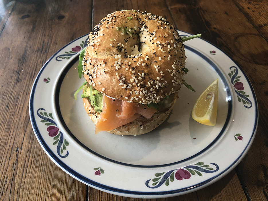 My towering, freshly-made bagel was layered with smoked salmon, avocado and lettuce ($14).