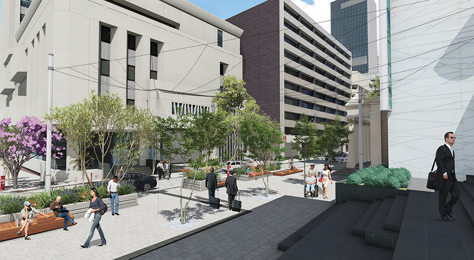 The works bring Hay Street down to 20kmh for a “pedestrian priority zone” around Pier and Irwin Streets, with trees, street furniture, wide footpaths and a new public space going in named Kaal yimniny, Noongar for “fire here”.