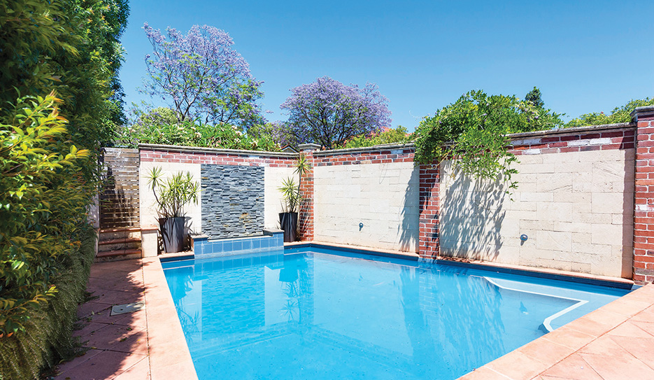 It’s a decent-sized pool with a stylish water feature at one end and high limestone walls offering privacy.