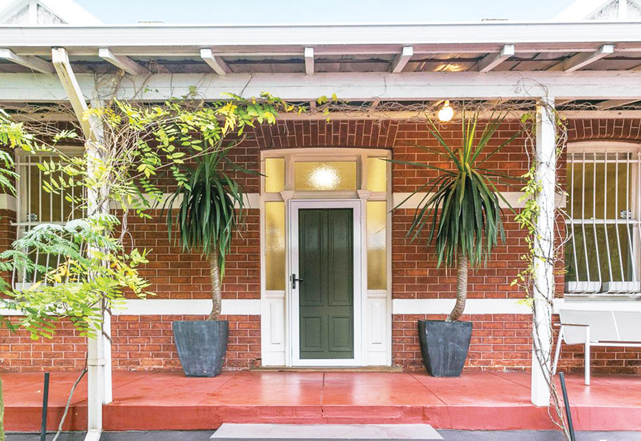 The facade of this three bedroom one bathroom abode has tuck-pointed brickwork and vines coiling around the beams of a white verandah.